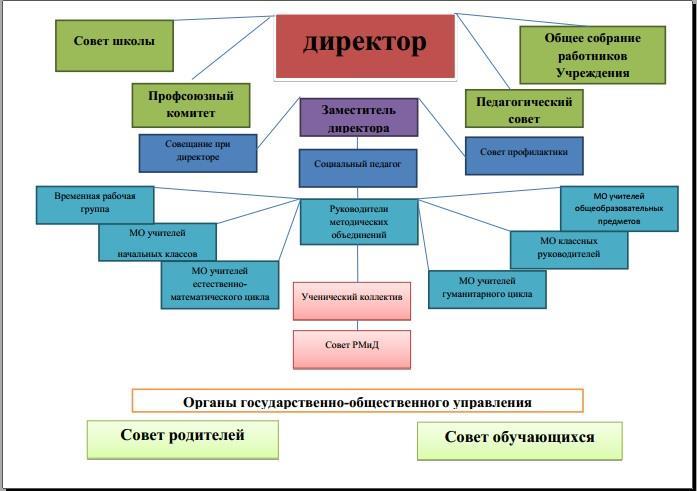 В школе сформированы и действуют органы коллегиального управления школой – совет школы, педагогический совет, общее собрание работников учреждения.